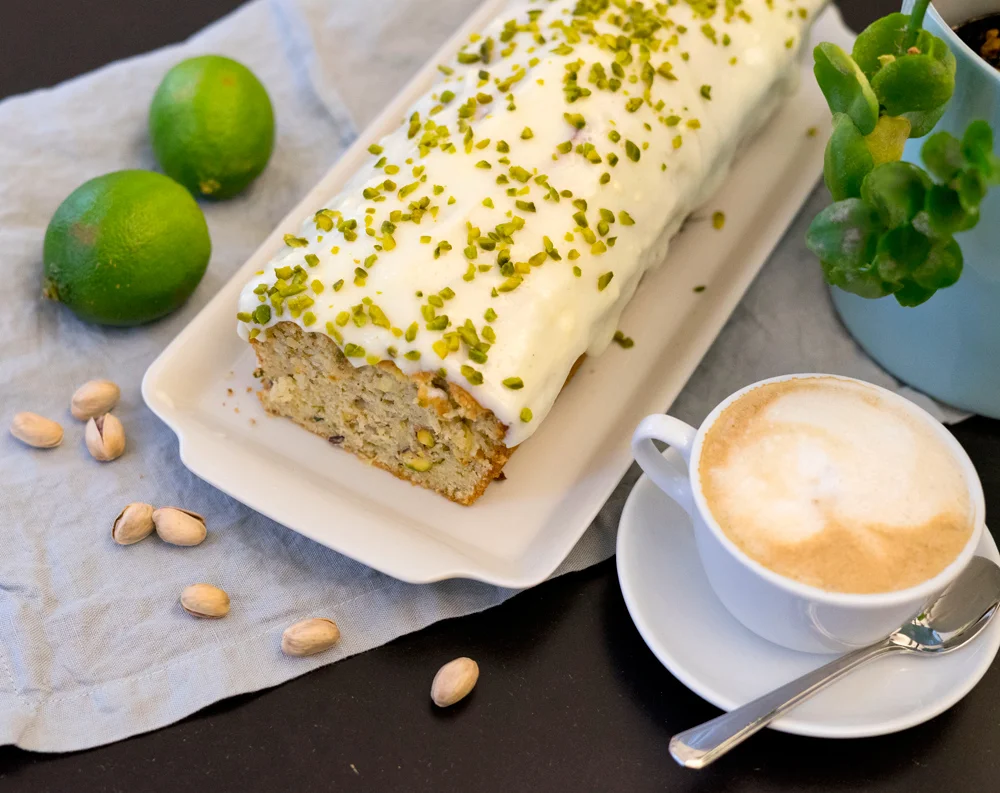 Eier, Zucker, Öl, Joghurt, Limttenschale und -saft in eine große Schüssel geben und mit dem Mixer verrühren. Die Zucchini reiben und zusammen mit Mehl, Mandeln und Backpulver hinzufügen. Die Pistazien grob hacken und ebenfalls untermengen bis eine homogene Masse entsteht. Diese in die vorbereitete Kuchenform füllen und für 45 bis 50 Minuten backen. Gegen Ende die Stäbchenprobe machen und dann auskühlen lassen.